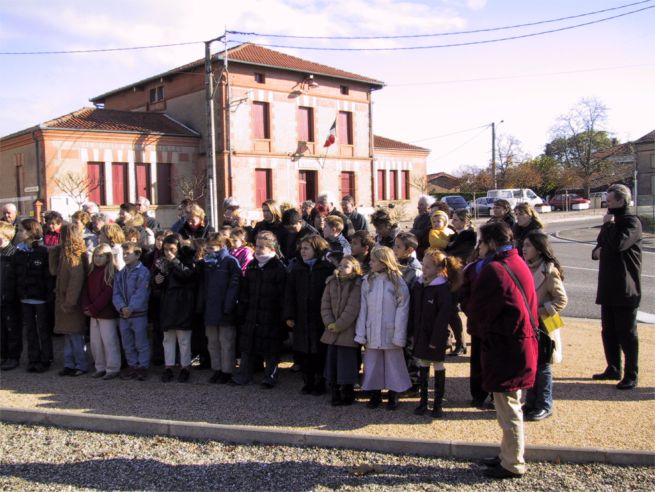 Après le dépôt d’une gerbe, la lecture du message du ministre des anciens combattants par Mr le Maire, la minute de silence, les enfants de l’école publique accompagnés de leurs enseignants ont chanté (à cappella) la « Marseillaise » sous la direction de Chantal.
