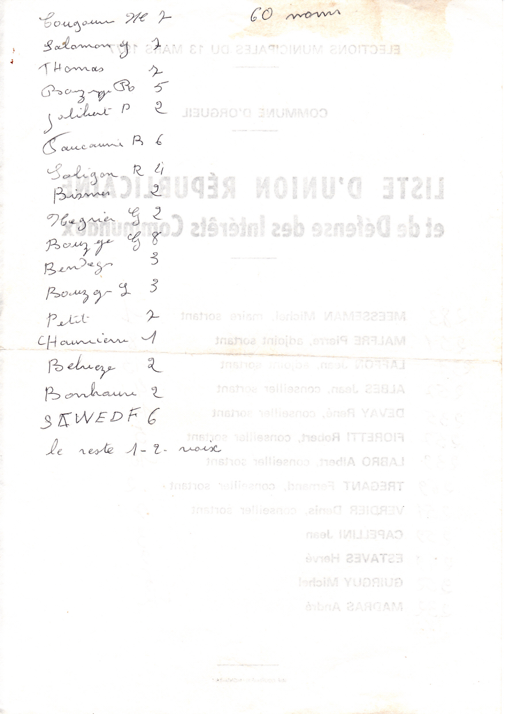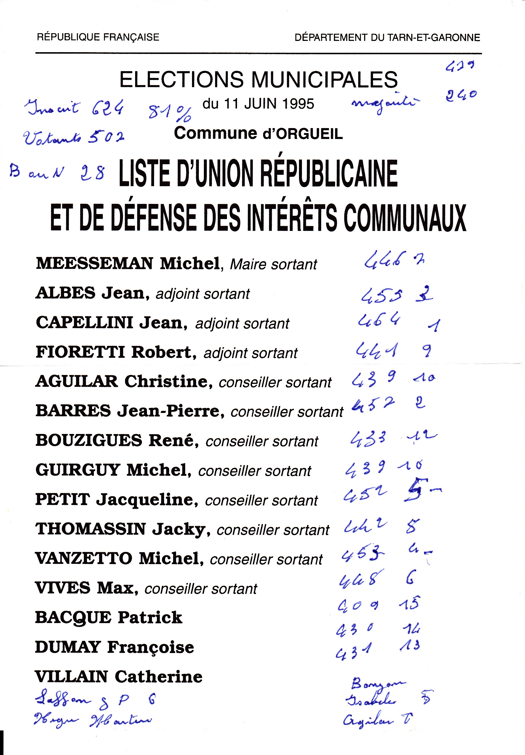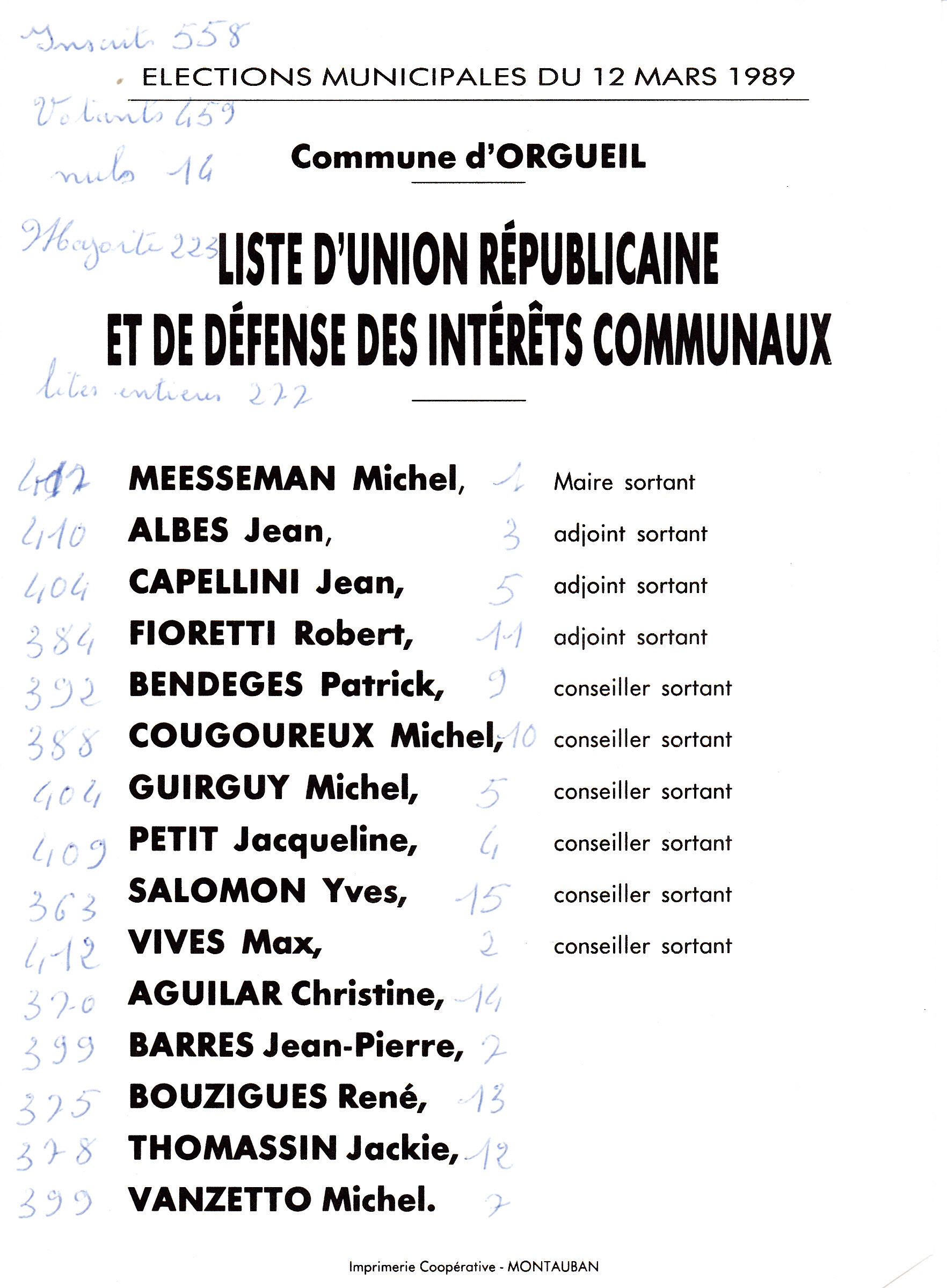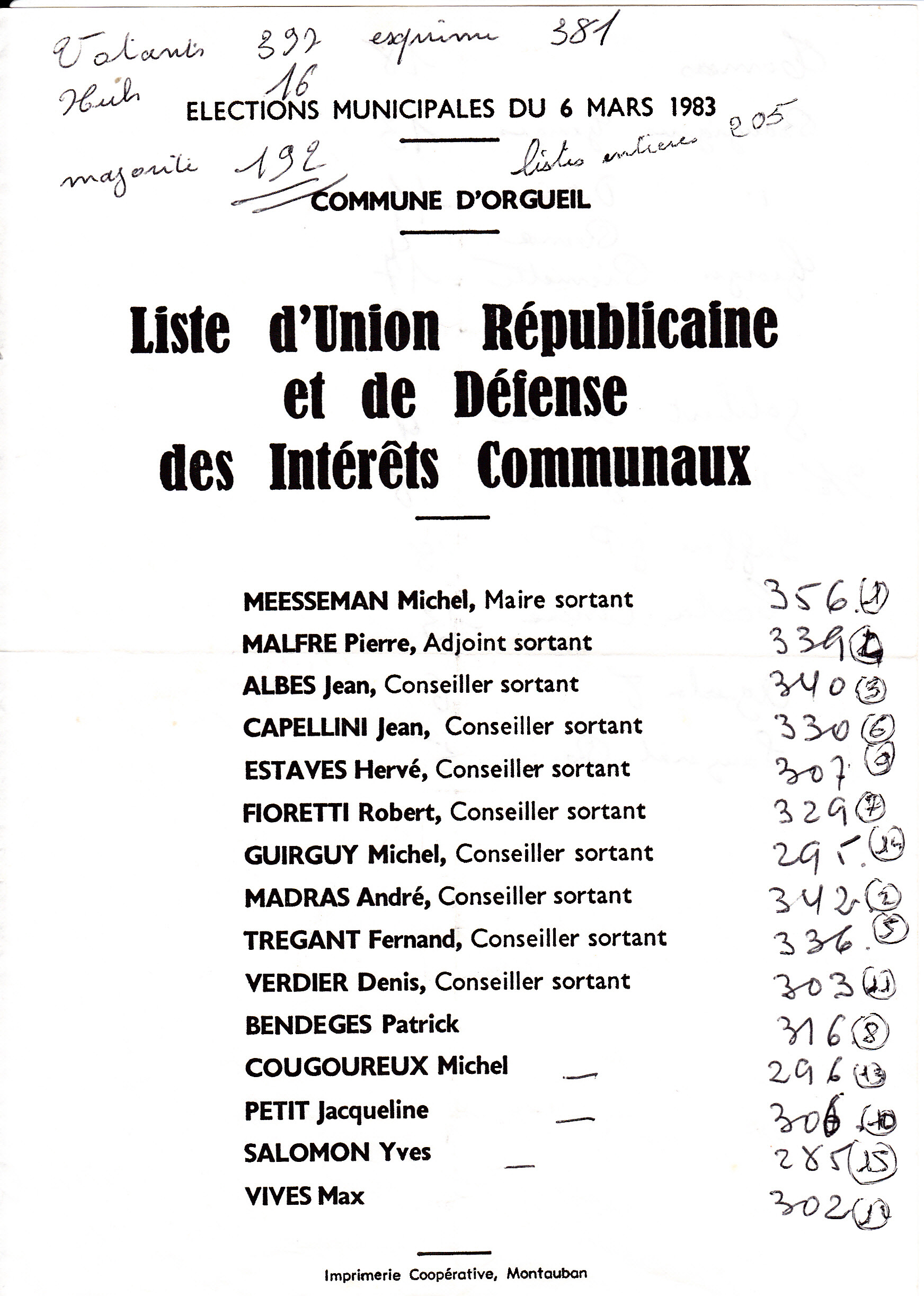06 mars 1983 : 397 votants, 16 bulletins nuls. La liste de Mr Michel Meesseman comporte 15 noms, et oui ! on élit maintenant 15 conseillers ! 12 personnes non présentes sur la liste obtiendrons des voix. Cette année là, Mme Jacqueline PETIT est la première femme a entrer dans le conseil municipal d’Orgueil, la féminisation est en marche, à petits pas.
