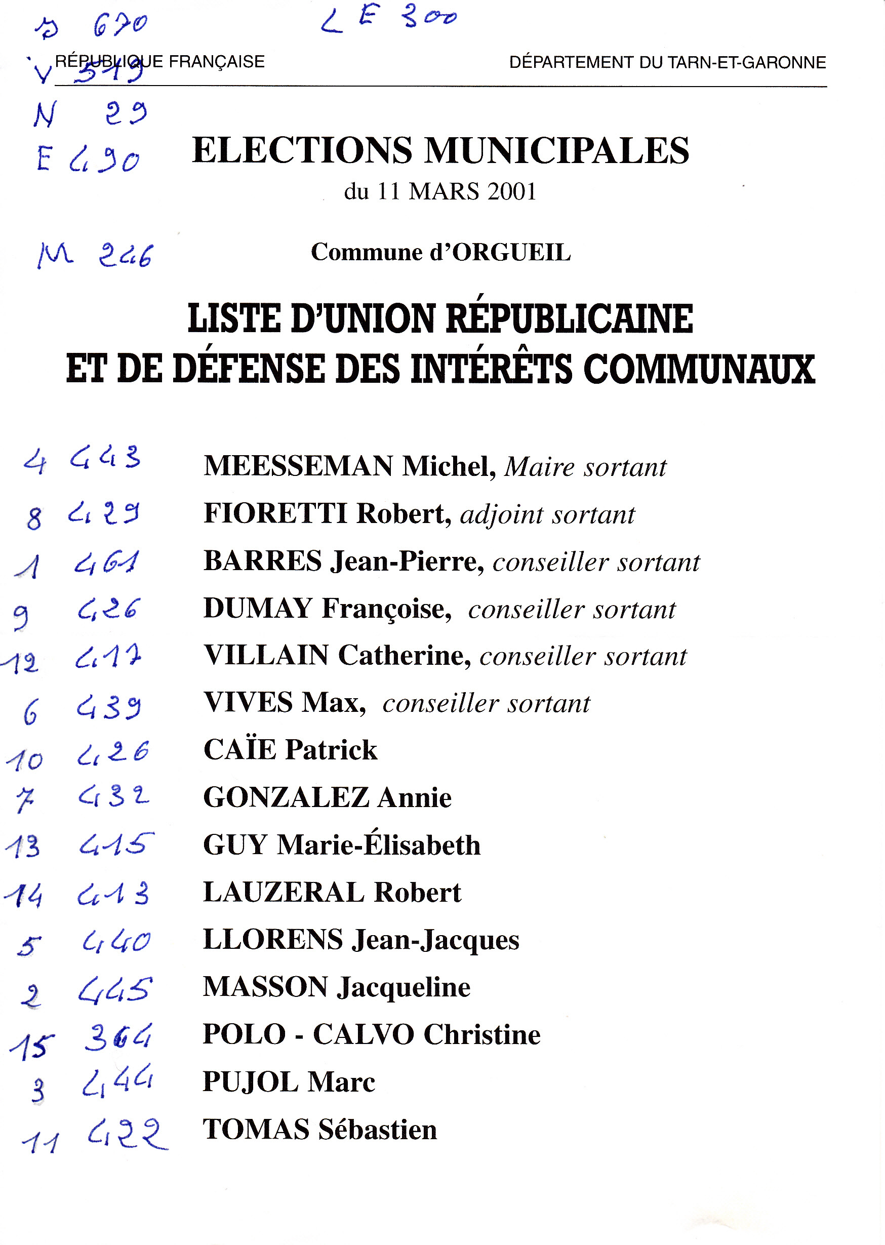 11 mars 2001 : 670 inscrits, 519 votants, 29 bulletins nuls. Sur cette liste on trouve 4 personnes qui font partie du conseil municipal élu en 2016 : Mme Catherine VILLAIN, Mme Marie-Élisabeth GUY, Mr Jean Jacques LLORENS, Mr Marc PUJOL.