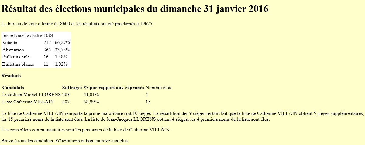 31 janvier 2016 : 1084 inscrits, 717 votants, 27 bulletins blancs ou nuls. Deux listes se sont présentées devant les électeurs. La liste de Madame Catherine VILLAIN ancienne conseillère municipale et ancienne 1re adjointe a obtenu la majorité des sièges. Madame Catherine VILLAIN a été élue Maire de la commune lors du premier conseil municipal et devient ainsi le 27e maire depuis 1792 et la première femme à ce poste . La liste de Mr Jean-Jacques LLORENS obtient 4 sièges. Composition du conseil : cliquez ICI