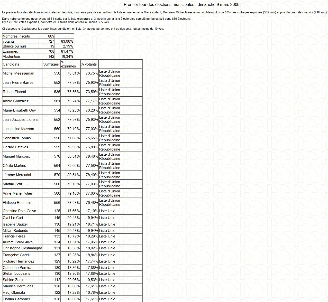9 mars 2008 : 869 inscrits, 727 votants, 19 bulletins blancs/nuls. Deux listes se présentent devant les électeurs, la liste de Mr Michel MEESSEMAN sera élue dans sa totalité, 34 personnes non inscrites sur une liste ont obtenu des voix.